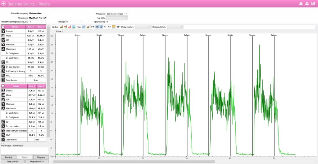 Badanie składa się z rejestracji aktywności spoczynkowej mięśni dna miednicy, próby wysiłkowej, tzn. badania skurczu i relaksu, elektrostymulacji ETS czyli elektrostymulacji wyzwalanej sygnałem EMG, oraz treningu biofeedback z wykorzystaniem prostych gier komputerowych. Na koniec powtórnie przeprowadzane jest badanie skurczu i relaksu (Ryc.2), w celu obserwacji zaistniałych zmian. Omawiany jest również proponowany plan terapii.